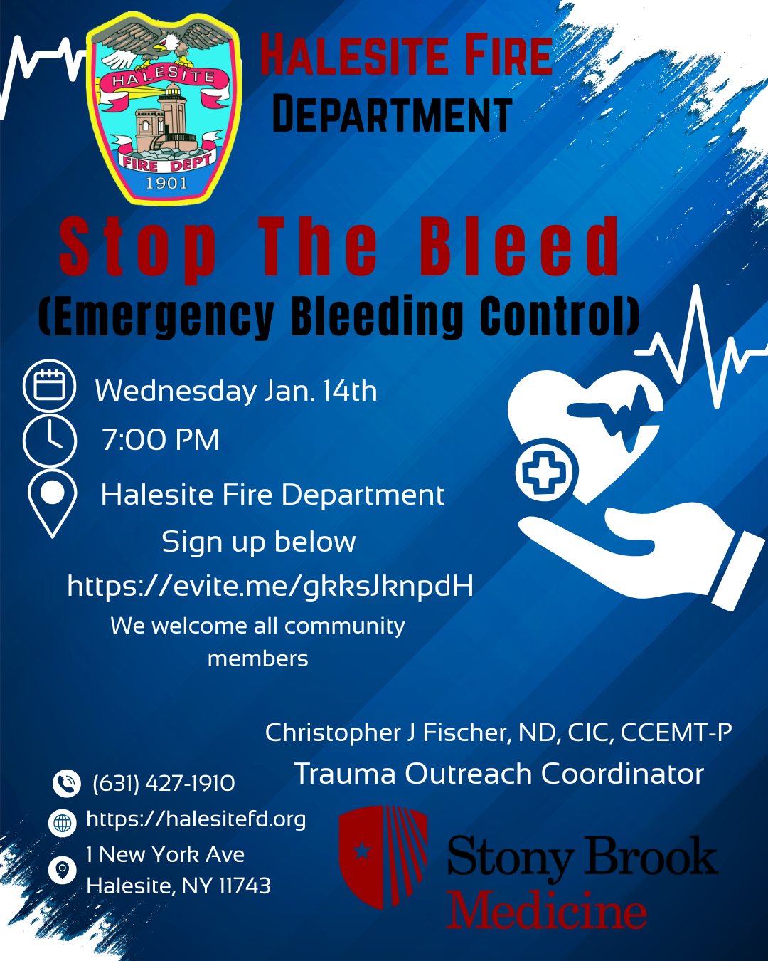 The Halesite Fire Department is hosting a Stop the Bleed class designed to teach community members how to recognize life-threatening bleeding and take immediate action to save a life. In an emergency, every second counts - and knowing what to do before first responders arrive can make all the difference.